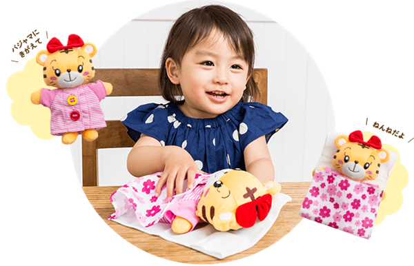 最初に届いた「はなちゃん(しまじろうの妹)お世話セット」で自分に妹が出来たかのように楽しそうにお世話を始めました。