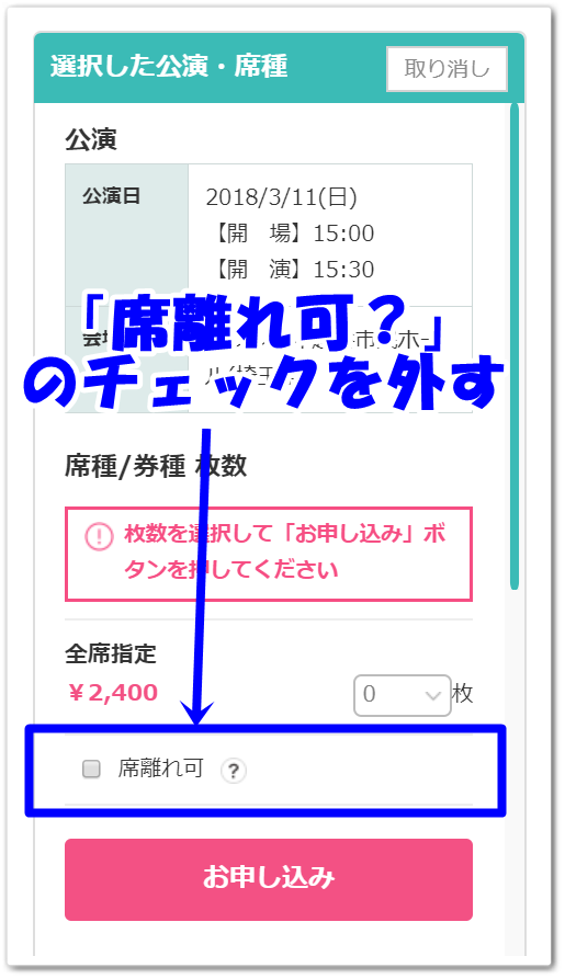 座席の指定はできませんが、1回の申し込みごとに購入手続き画面で「席離れ可?」というチェック項目が現れます。ここでチケット人数分の席が離れても良いか否かを選ぶことが出来るので、「席離れ可?」のチェックを外しておくと「席離れ不可」を希望することができるというわけです。