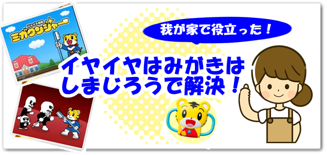 ベネッセの「ハミガキ戦隊ミガクンジャー」でしまじろうとムシバイキンの戦いを見せてまずは歯磨きの大切さを伝えました。