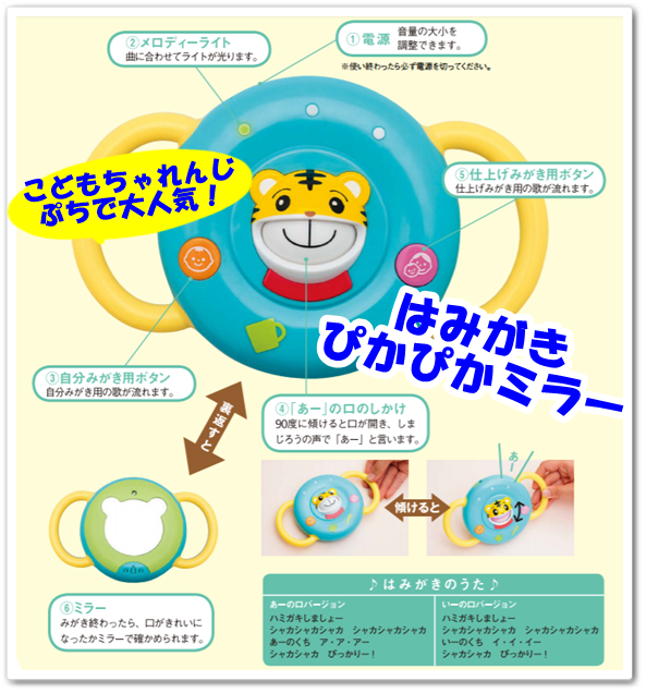 - 自分の口の中が見えるのが楽しい様で、仕上げ磨き中もおとなしくしてくれるようになりました。実家に帰るときもしまじろうのミラーは絶対に持参するほどです。