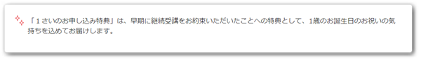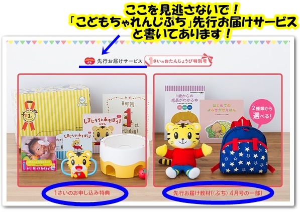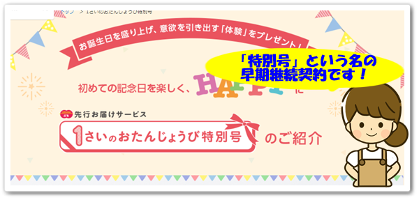 「こどもちゃれんじbaby」を受講中に『1さいのおたんじょうび特別号』という名の先行お届けサービス案内があります。これに申し込むと「1さいのお申し込み特典」と「先行お届け教材(「ぷち」4月号教材の一部)」がセットで届いてかなりお得に見えるのですが・・・これを受け取った時点で「こどもちゃれんじぷち」への継続受講を早期に約束したことになります。