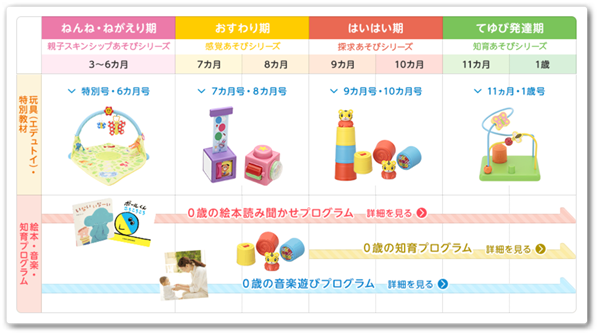 お子さんがその月齢になる付きの前月12日までに申し込みをすれば、月齢に合わせた教材が届きます。