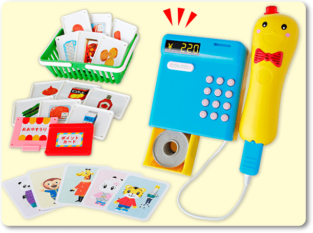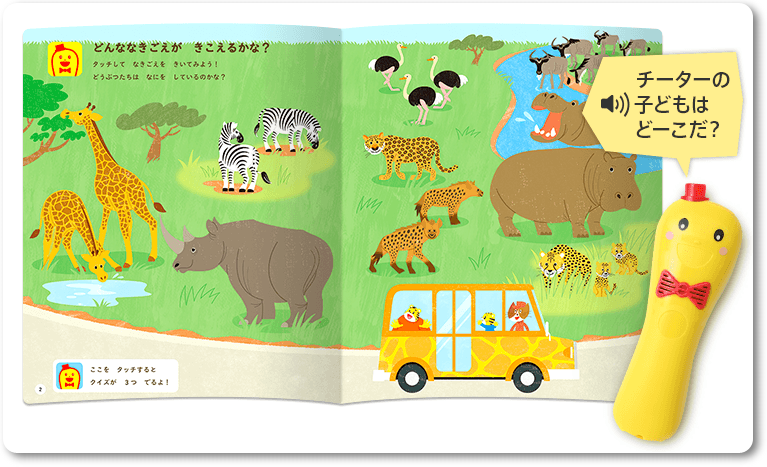 お店に売っているものの名前や迷子になったときの応え方など、音声タッチペンを使って楽しく学べます。