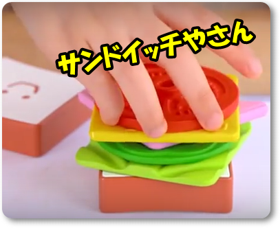 まる・さんかく・しかくという基本の形やカラフルな色に触れながら、おままごとでどんどん発話が増えていく工夫がなされています。マヨネーズはボタンを押すとマヨネーズが出てくる仕掛けがあってお料理気分を盛り上げてくれるので子供もお気に入りです。ヤフオクなどでも中古で2,000~4,000円という高値で取引されている程、人気のおもちゃです。